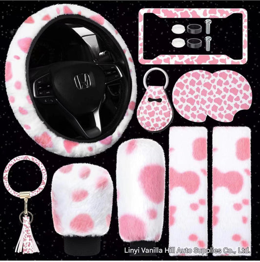 Sale price £23.49Shipping IncludedDeluxe 10-Piece Car Accessories Set – Stylish Steering Wheel Cover, Handbrake & Gear Shift Covers, Shoulder Pads, Cup Mat, Keychain in Cow Print Style