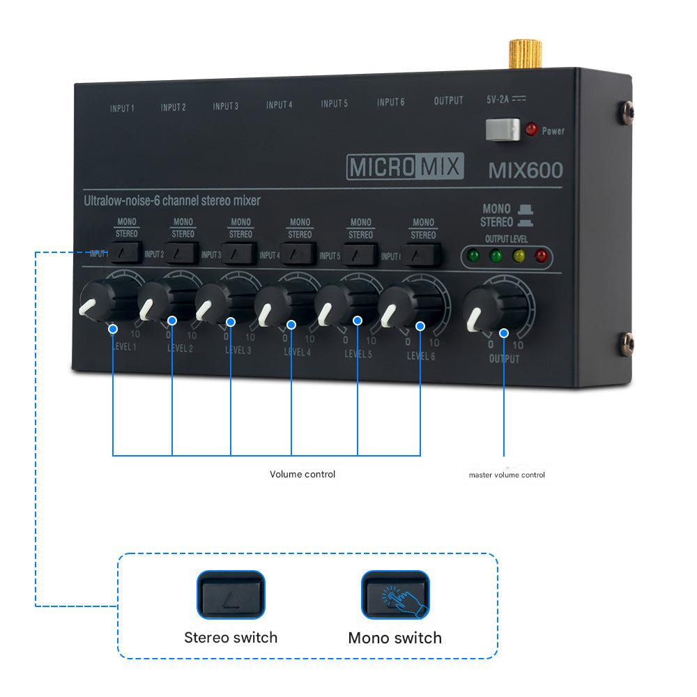• 6-Channel Mixing: Effortlessly combine multiple audio sources for professional sound.