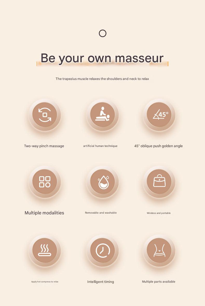 The Cordless Neck and Shoulder Massager is a cutting-edge device designed to alleviate tension and promote relaxation in your upper body. It features innovative heat therapy to soothe sore muscles, making it perfect for anyone experiencing discomfort from long hours of sitting or stress. You can enjoy the relief it offers daily, whether you're unwinding after work or preparing for sleep. Operating on a rechargeable battery, this device is portable and convenient, allowing you to carry it with you wherever you go. Its skin-friendly PU material makes it comfortable to use, and the adjustable intensity settings let you personalize your massage experience. Don't forget to clean it after use to keep it in top condition!