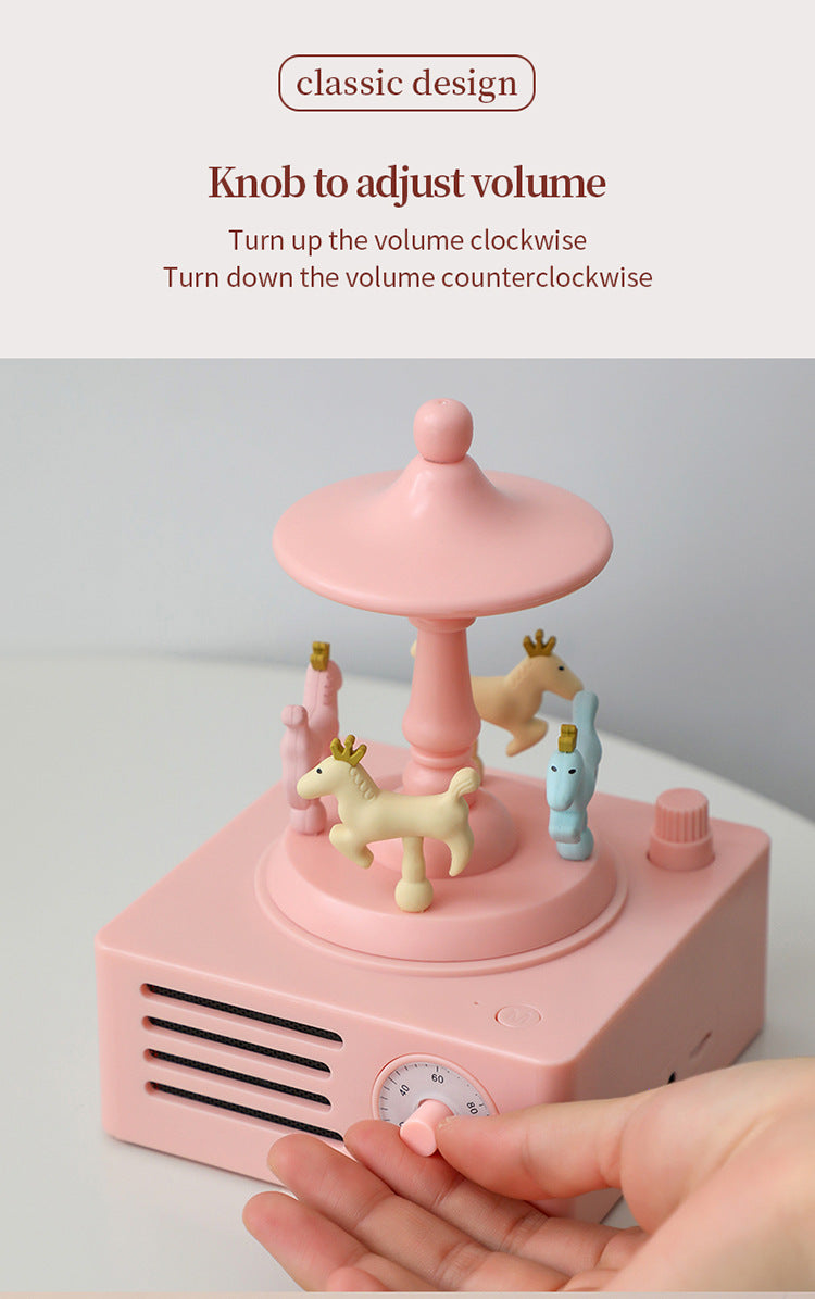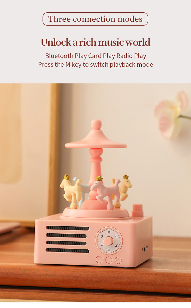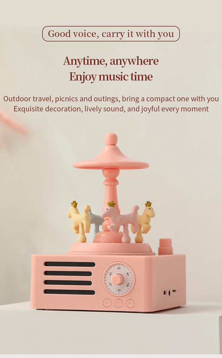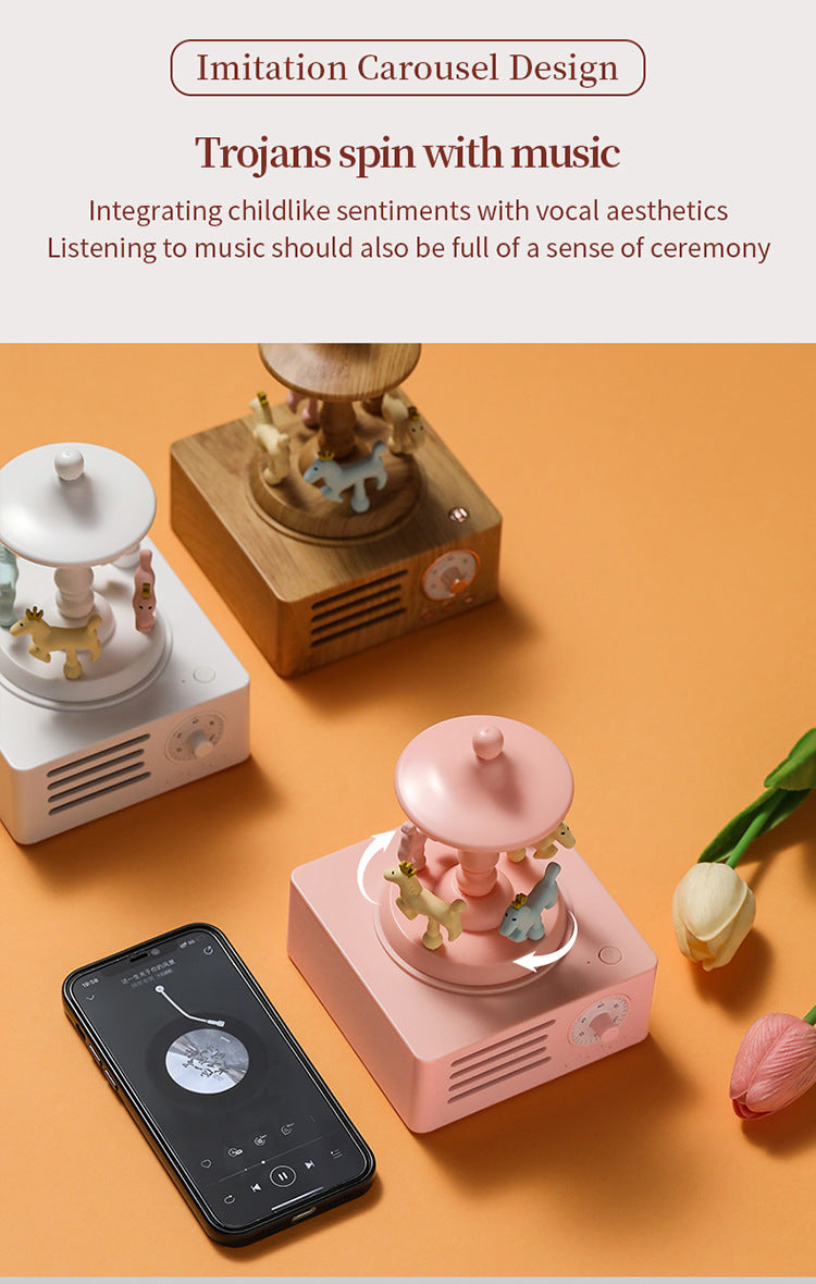 The T15 Bluetooth Carousel Speaker combines functionality and style into one compact audio device. With Bluetooth 5.0 technology, you can easily connect your devices for a wireless music experience up to 10 meters away. The sleek, creative design is perfect for home, office, or as a unique gift. Featuring a robust 5W output, the speaker ensures high-quality sound for your favorite playlists. Its built-in battery with a 300mAh capacity lets you enjoy uninterrupted music, while the IPX4 water resistance rating allows safe outdoor use. Perfect for any season, the T15 is not just an audio device but also a stunning decorative piece.
