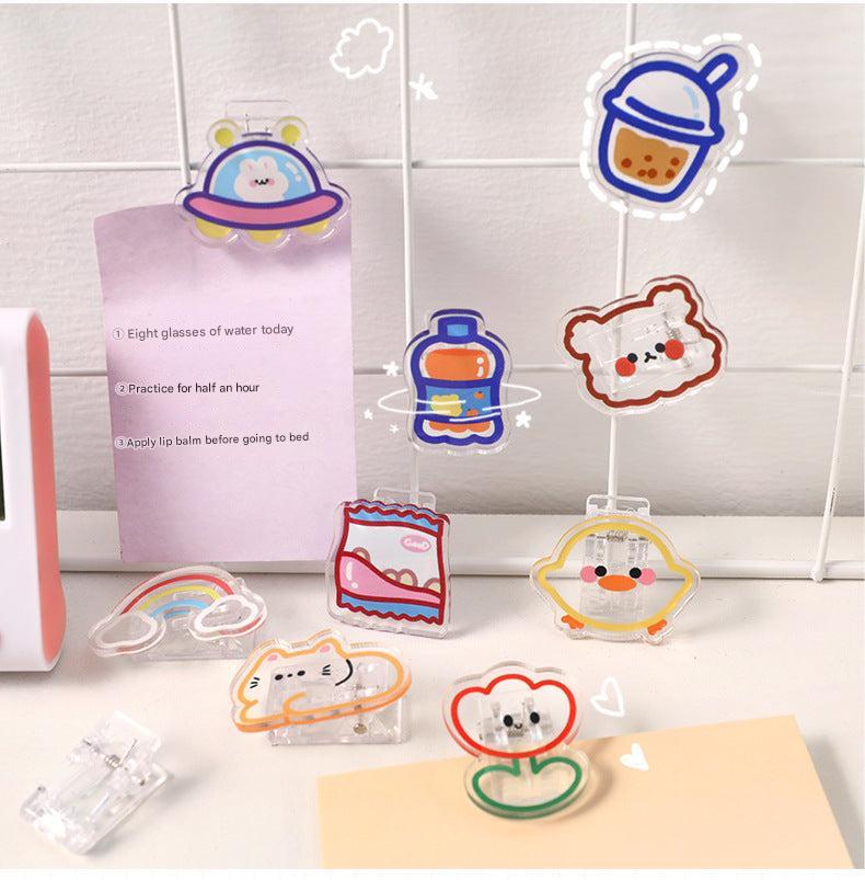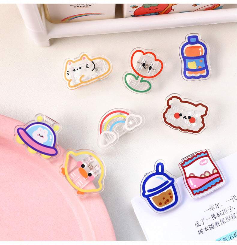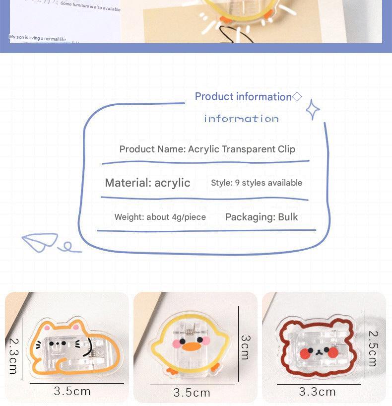 Brighten up your daily tasks with our charming collection of Cute Acrylic Clips! Whether you're a student securing papers and notes, or a homeowner keeping snacks fresh, our clips offer both functionality and style. Each clip features a distinctive and playful design, from Awe Bear to Lazy Cat, adding a touch of whimsy to your daily routine. Crafted from sturdy acrylic, these clips promise durability and ease of use. With their compact size, they fit perfectly on various packages and paper sizes. Additionally, this bulk packaging ensures you always have a clip handy when you need one!
