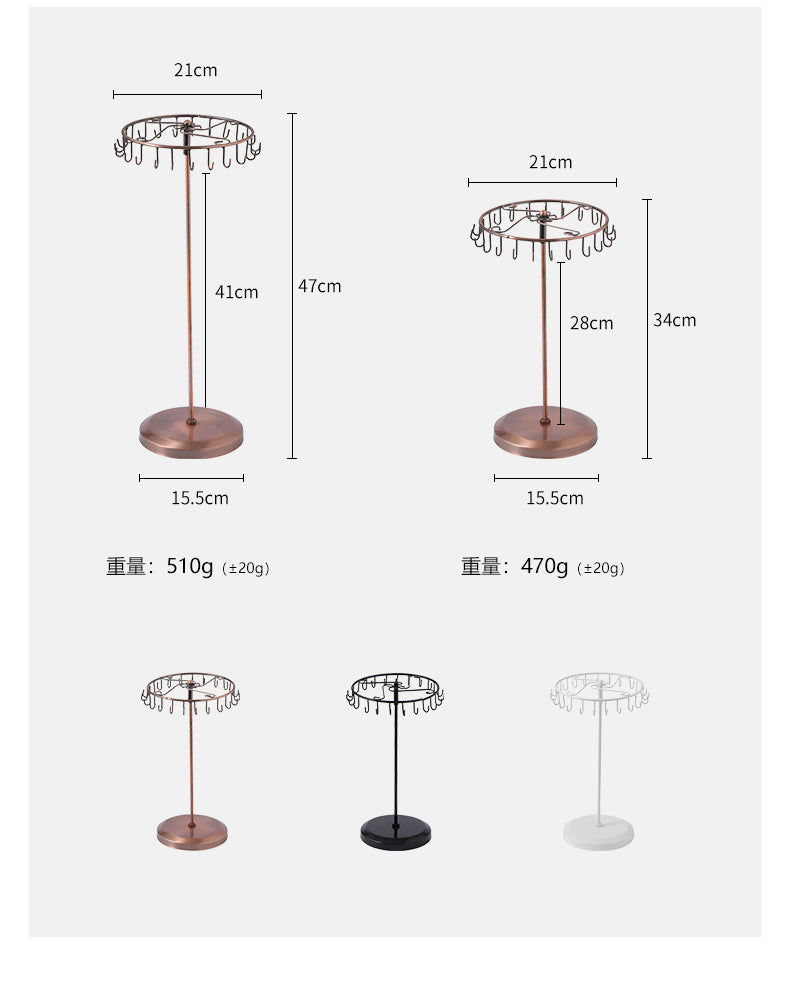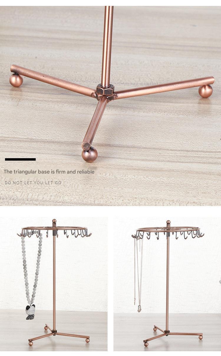 Transform your accessory storage with our Elegant Metal Jewelry Organizer Stand! This rotatable stand is designed to hold up to 23 pieces and is perfect for displaying a variety of jewelry items such as necklaces, earrings, and bracelets. Crafted from high-quality metal, it offers durability and long-lasting use. The organizer is available in elegant finishes of antique bronze or black, with both triangle and round base options, perfectly complementing any home or store decor. Despite its spacious display capability, the stand is compact (20cm x 34cm), making it ideal for placement on dressers, shelves, or retail counters. Easy to assemble and disassemble, this jewelry stand ensures portability and convenient storage, making it an essential item for home jewelry organization or commercial display.