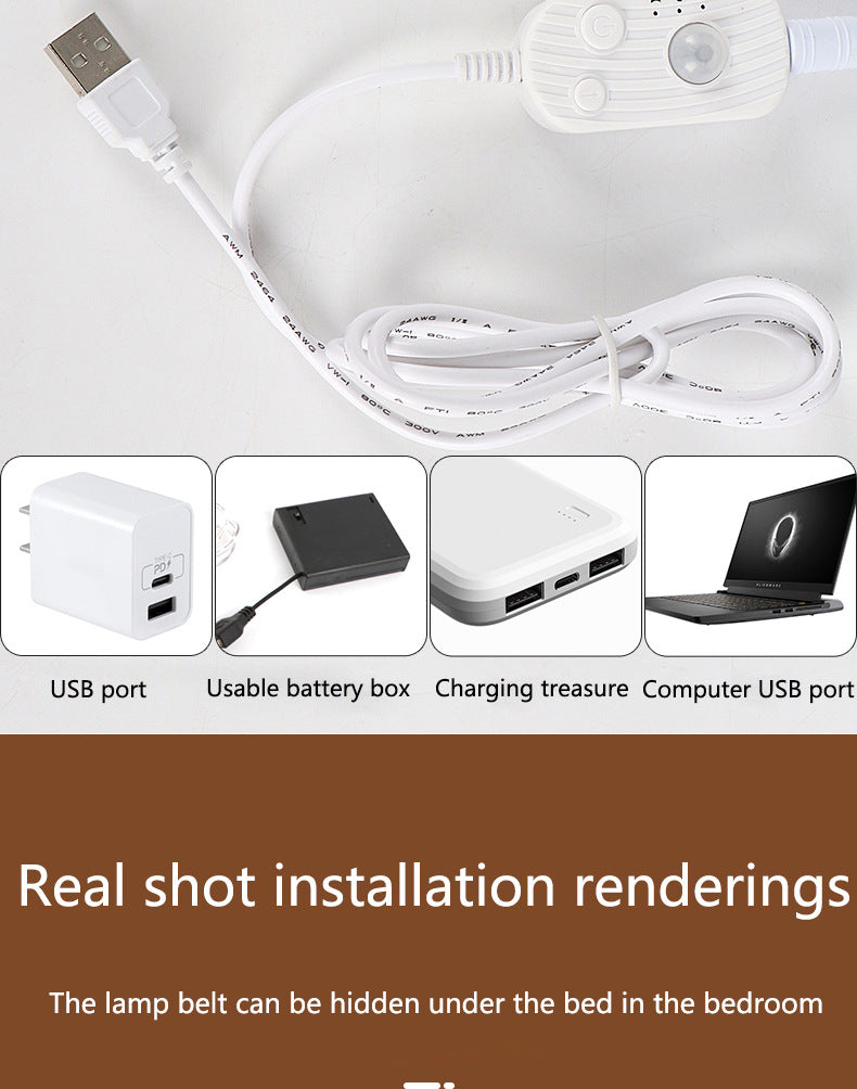 Upgrade your home lighting with our Motion-Activated Flexible LED Light Strips. These strips feature state-of-the-art motion sensors that automatically light up when you approach, making them perfect for places like wardrobes, kitchen cabinets, and beneath beds. The flexible design allows the strips to curve and bend around corners, providing a seamless and adaptive fit for any furnishing. Choose between warm or white light to create your ideal atmosphere. Installation is a breeze with the simple USB power connection, ensuring compatibility with a variety of power sources, including portable power banks, making them ideal for areas without direct electrical outlets. Their water-resistant construction means they can safely be used in kitchens and bathrooms without worry of moisture damage.