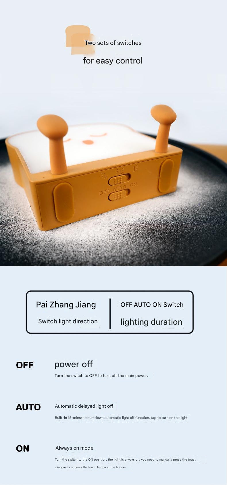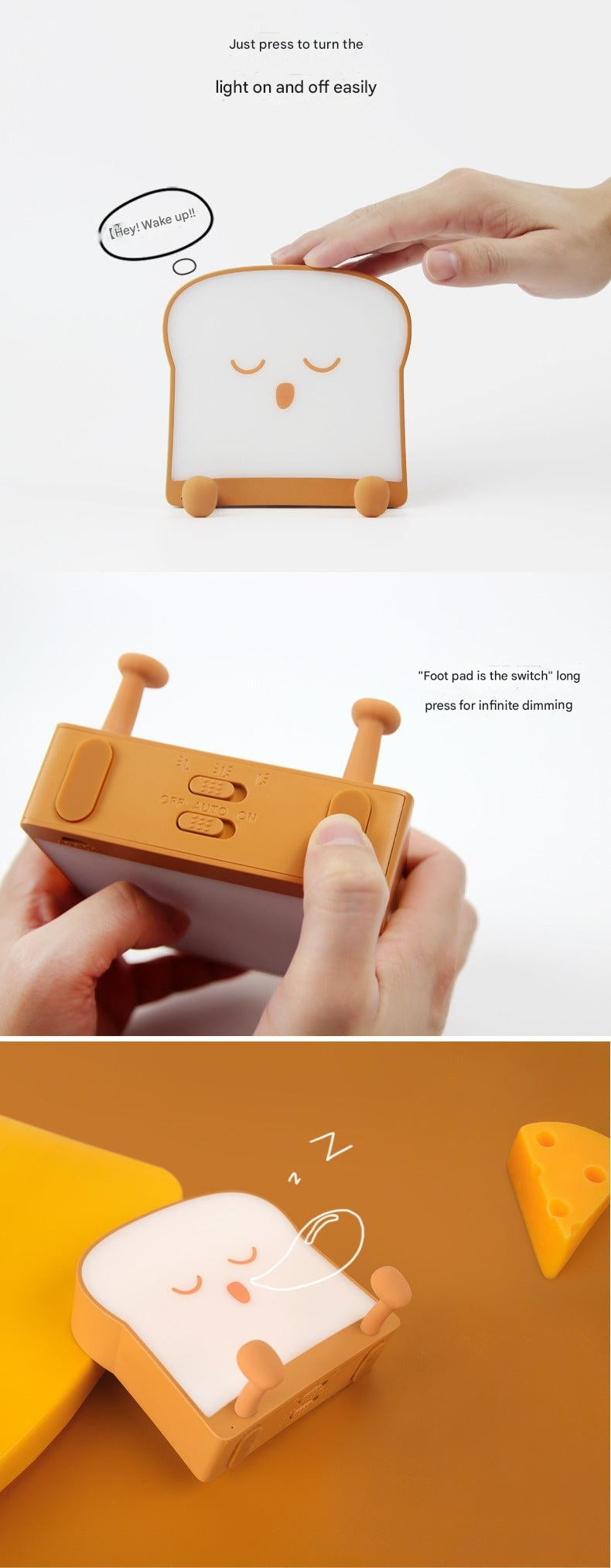 Illuminate your bedtime routine with our USB Charging Toast Bread Night Light, a perfect blend of functionality and whimsy. Designed to evoke the familiar and comforting shape of toast, this night light adds a dash of cuteness to any bedroom. It features touch-sensitive controls, making it easy to operate even in the dark. Simply tap the bread to switch between different light settings, ensuring the perfect ambiance for your sleep.